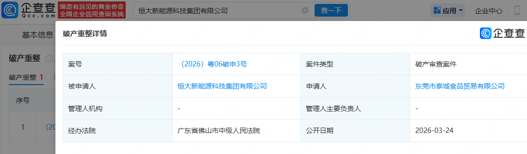 近日,恒大新能源科技集团有限公司新增一则破产审查案件,申请人为东莞市泰城食品贸易有限公司,经办法院为广东省佛山市中级人民法院。企查查显示,恒大新能源科技集团有限公司成立于2019年1月,法定代表人为李林林,注册资本10亿美元,由恒大凯宏投资(深圳)有限公司全资持股。风险信息显示,该公司关联多条被执行、限制高消费、失信被执行信息。
